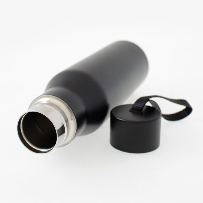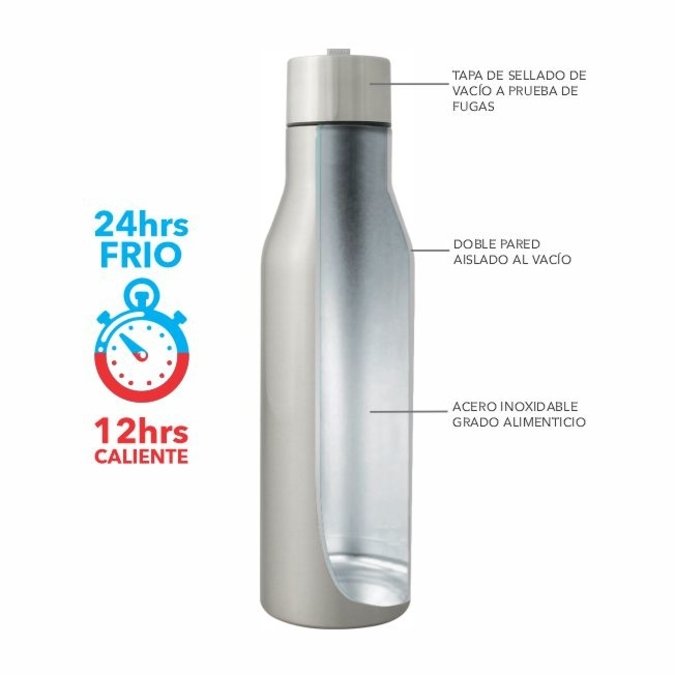 Botella de acero inoxidable de doble pared que permite mantener bebidas frías durante 24 horas o calientes durante 12 horas. Agarradera de nylon. Cierre perfecto para evitar cualquier derrame. Capacidad: 500 ml.