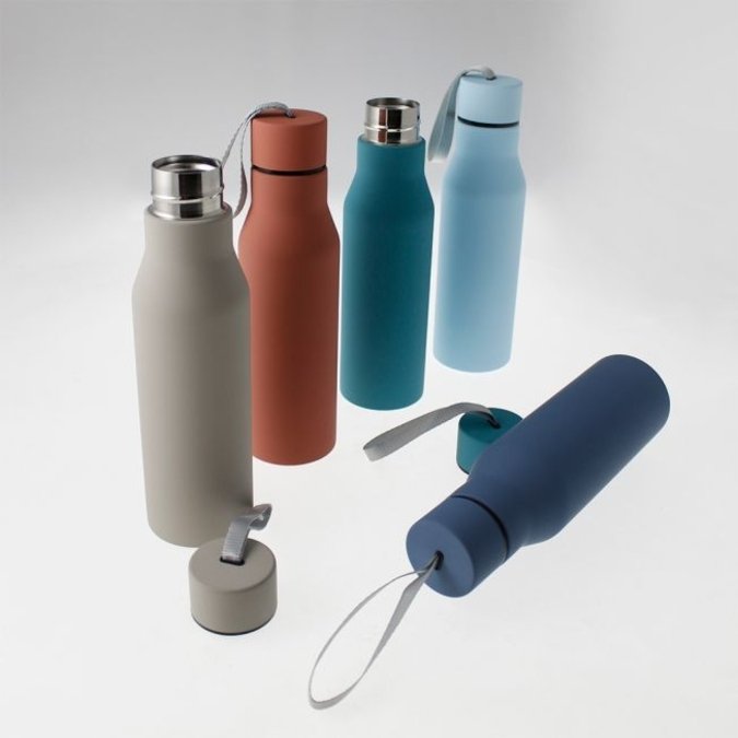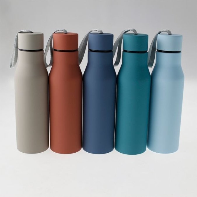 Textura ultrasuave. Fabricado en acero inoxidable de doble pared que permite mantener bebidas frías y calientes por 24 y 12 horas. Tapa con cierre de rosca “cero derrames” y agarradera de nylon