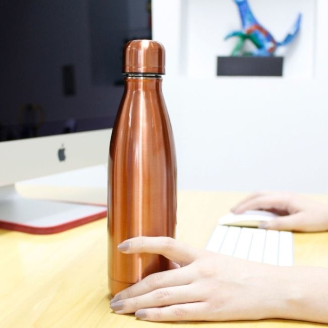 Botella de 500 ml. Acabados mate y de alto brillo. Fabricado en acero inoxidable con doble pared. Tapón con sellado de vacío que garantiza el cero derrame