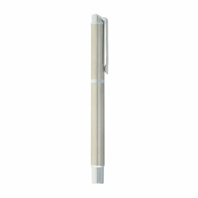Bolígrafo metálico con tapón que cierra a presión. Detalles color cromo. El bolígrafo negro y azul tienen una suave textura ahulada. Escritura de alto desempeño debido a su repuesto japonés tipo roller