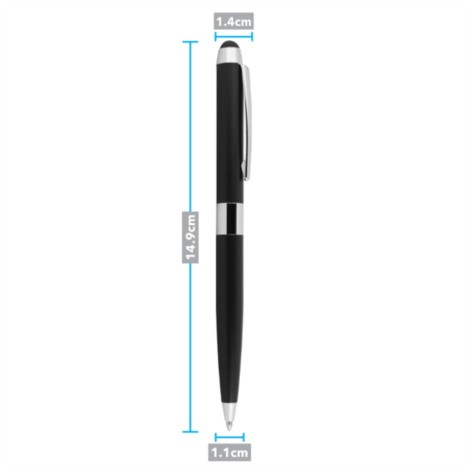 Bolígrafo metálico de una sola pieza. Mecanismo de giro. Cuenta con touch en el extremo opuesto a la punta. Tinta negra