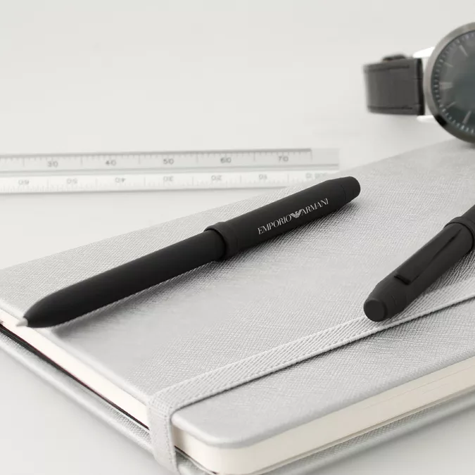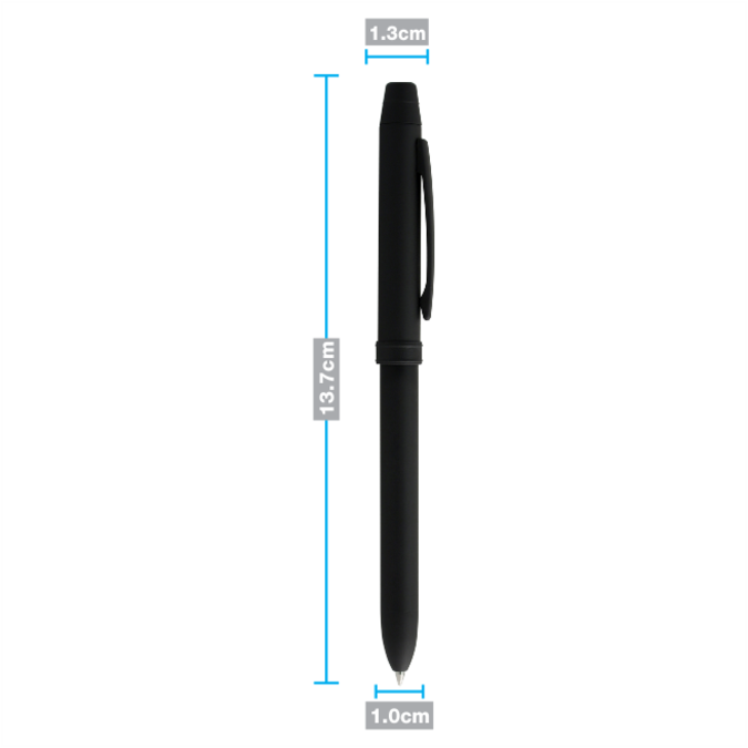 Bolígrafo metálico multifuncional de acero inoxidable con acabado negro mate. Mecanismo de giro. Tinta negra, Tinta roja y Lapicero. Pequeño borrador en la parte superior cubierto con tapón de rosca