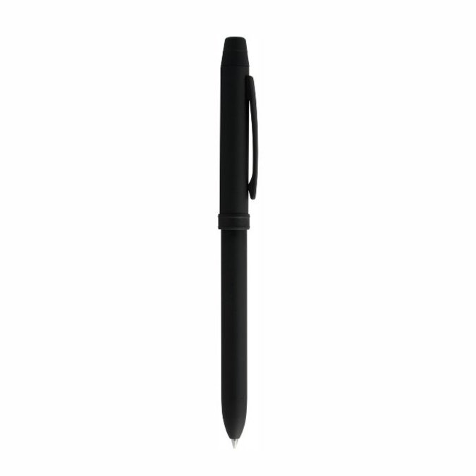 Bolígrafo metálico multifuncional de acero inoxidable con acabado negro mate. Mecanismo de giro. Tinta negra, Tinta roja y Lapicero. Pequeño borrador en la …