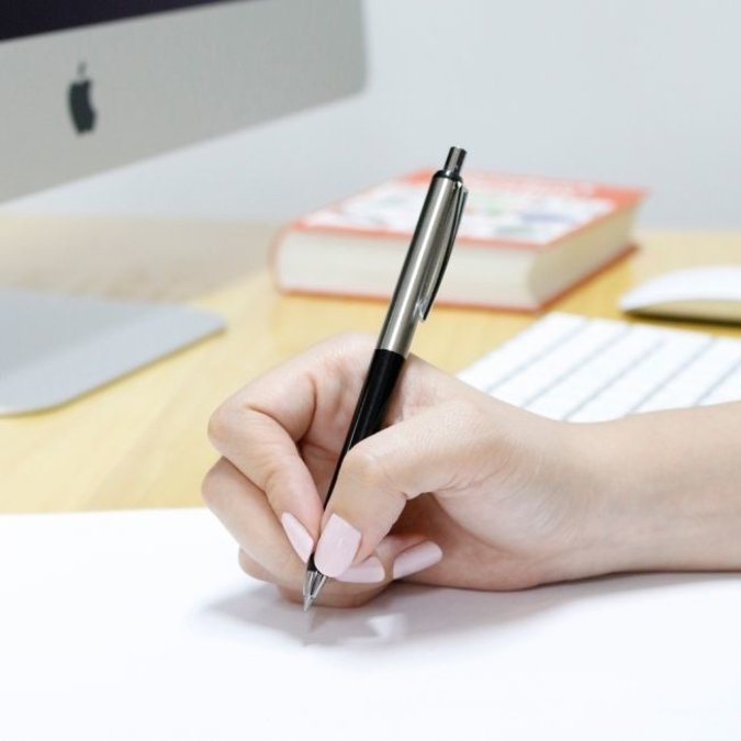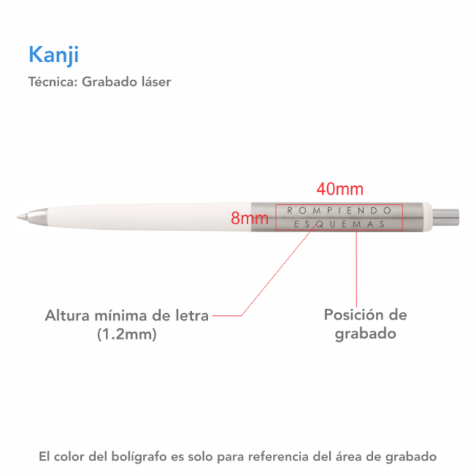 Bolígrafo Japonés de mecanismo retráctil. Hecho en 2 materiales. La parte de acero inoxidable permite grabado en oxidación. Mientras que el extremo de plástico define el color y le da ligereza al producto