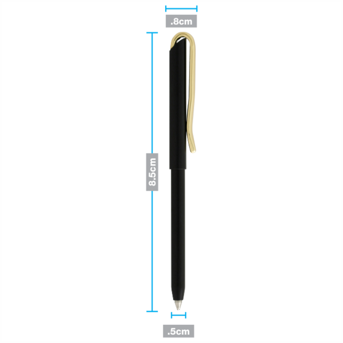 Bolígrafo metálico ultra delgado en color negro satinado con clip dorado o cromado. Ideal para llevar en la cartera
