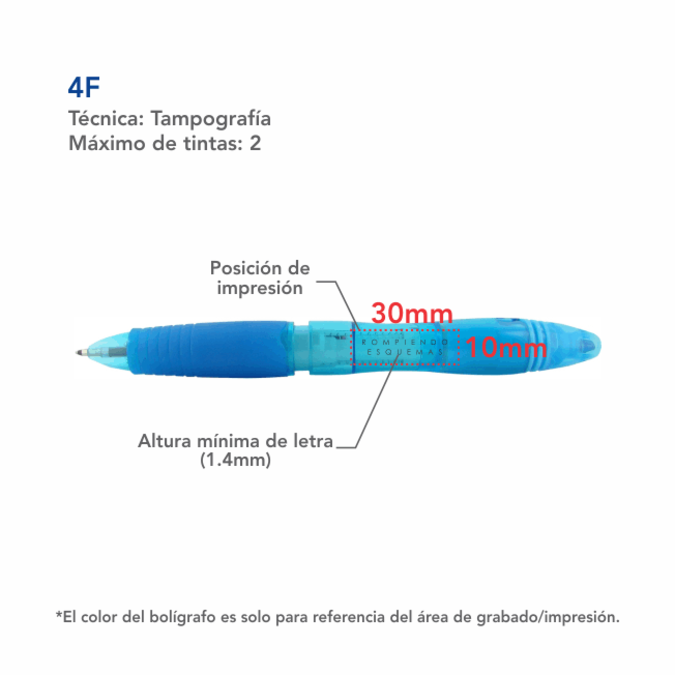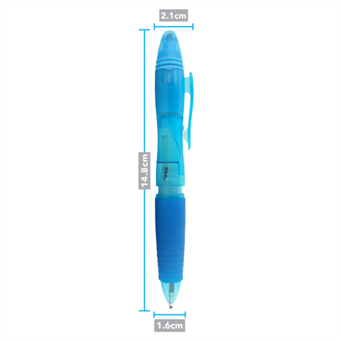 Bolígrafo de plástico multifuncional. Cuenta con grip. Mecanismo de giro. Tinta Negra, Roja, Lapicero y Resaltador del mismo color del cuerpo