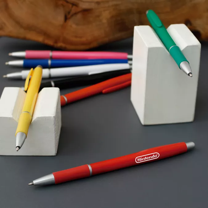 Bolígrafo de plástico en colores sólidos y detalles en color plata. Cuenta con un grip para mayor comodidad