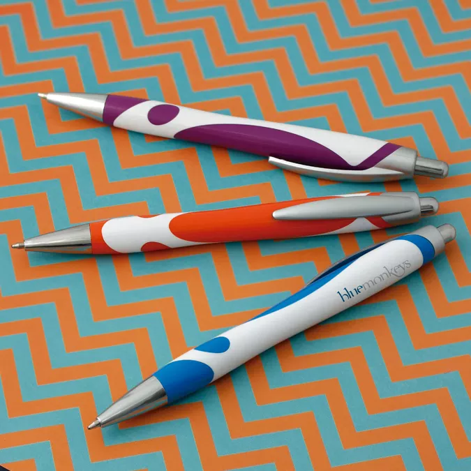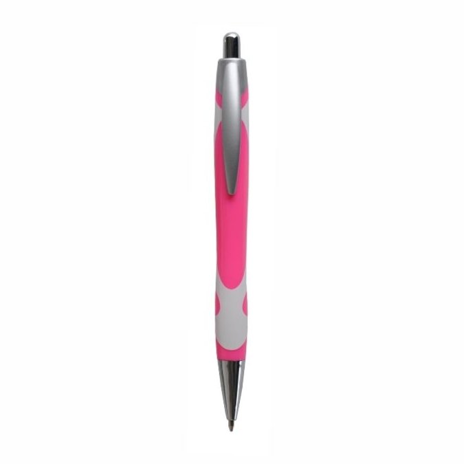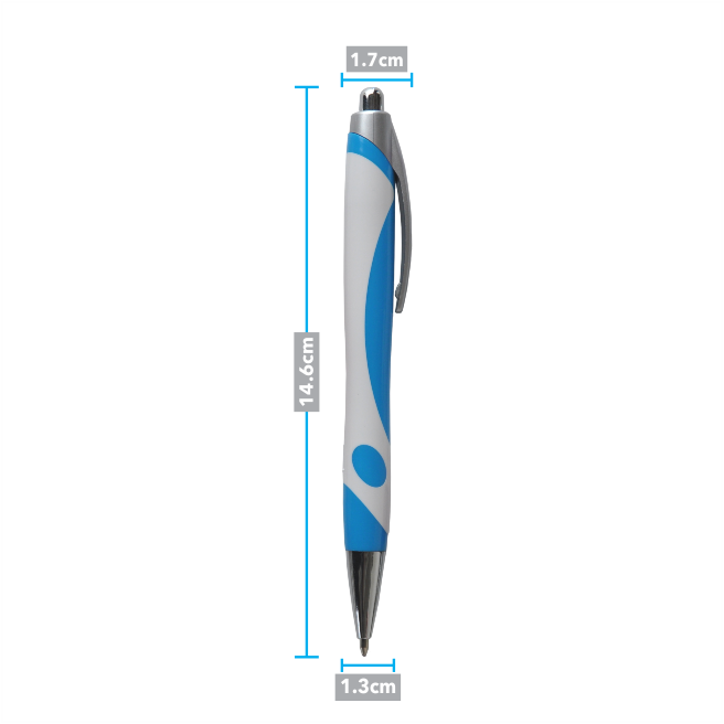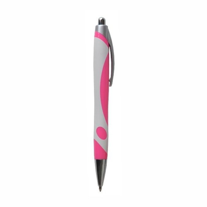 Bolígrafo de plástico con cuerpo blanco sólido, combinado con detalles de color. Mecanismo retráctil. Tinta Negra.