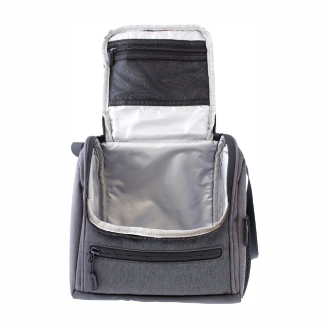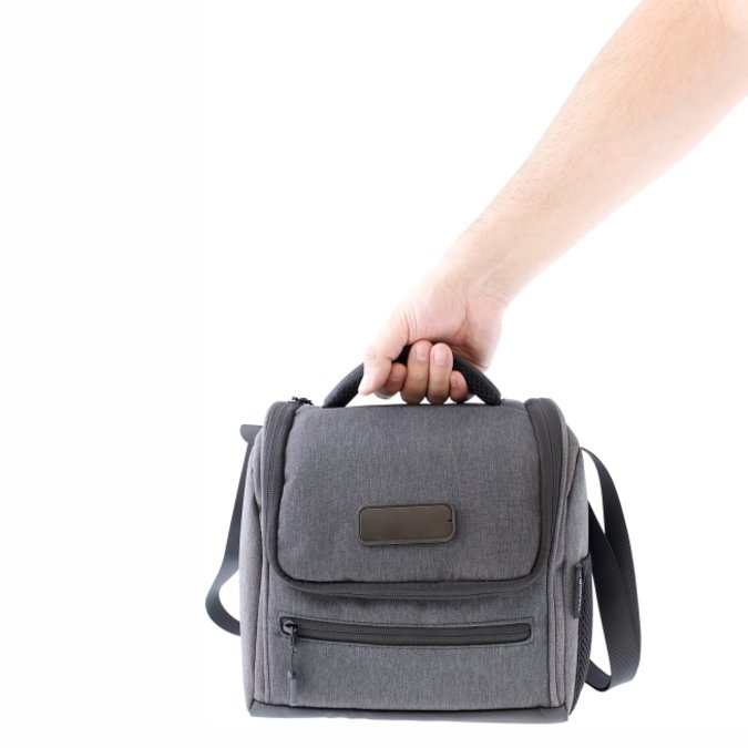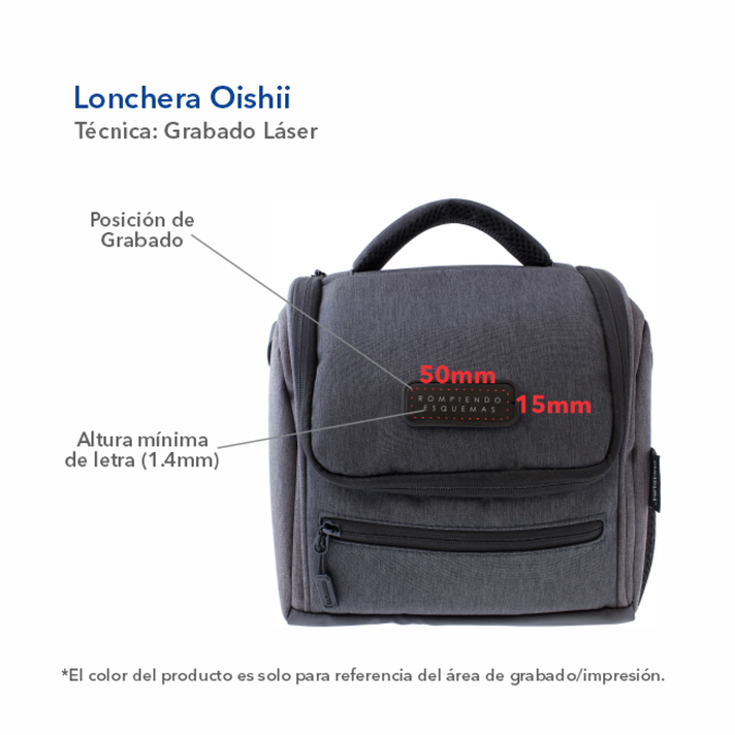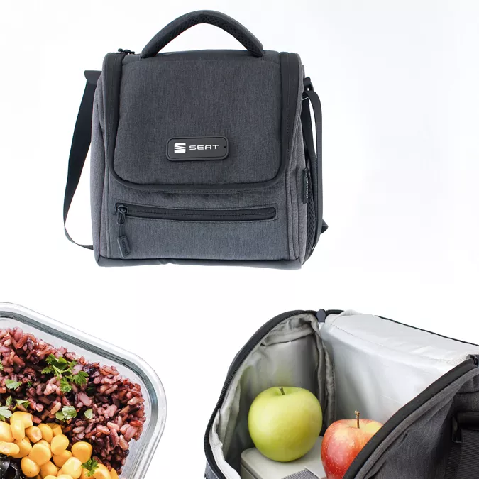 Tela exterior repelente al agua. Interior con aislante térmico, bolsa interior con malla y cierre, Malla lateral para colocar bebidas