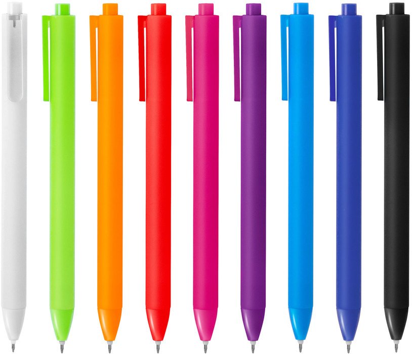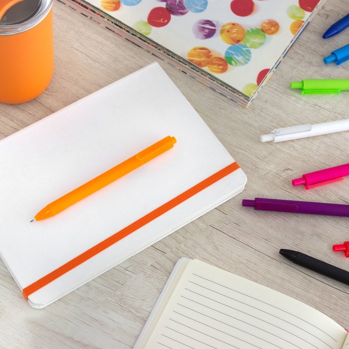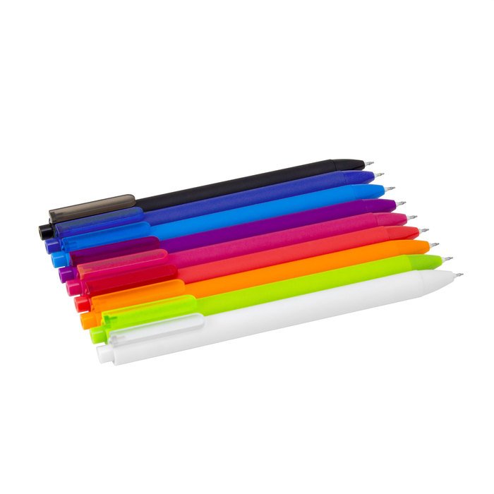 Bolígrafo retráctil con tinta gel. Pulsador y puntera del mismo color del cuerpo acabado brillante.