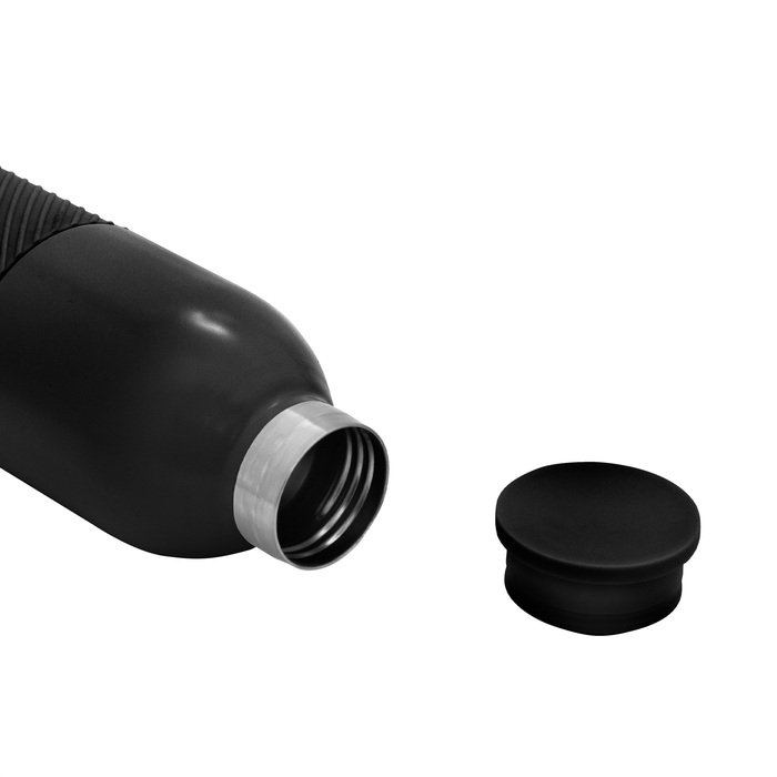 Capacidad 500 ml. Vidrio. Botella de vidrio con acabado frosty. Tapa de acero inoxidable, aro de silicona antiderrame y correa de tela reforzada.