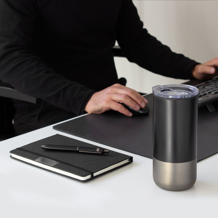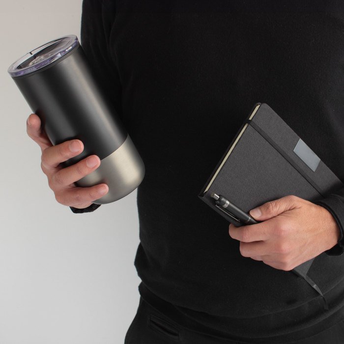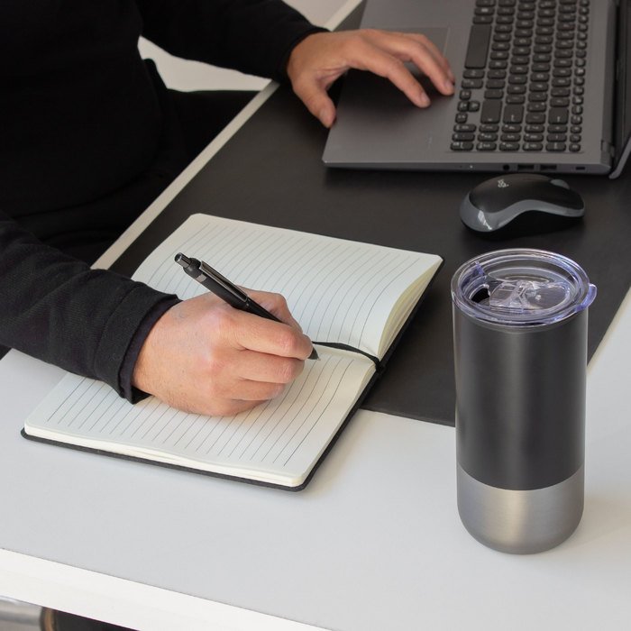 Caja de regalo compuesta por 3 artículos: Bolígrafo de aluminio negro mate. Libreta de 14×21 co placa metálica de 80 hojas, mug metálico de 450 ml.