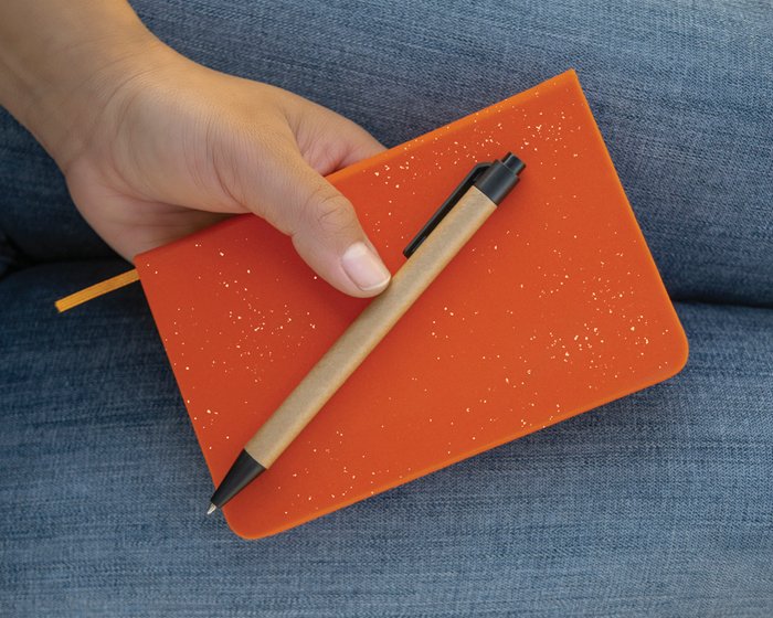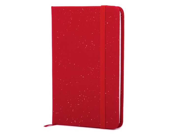 Pasta rígida cubierta de curpiel texturizado. De 80 hojas rayadas . Incluye dos compartimentos en el exterior, uno para bolígrafo (no incluido) y el otro para smartphone.