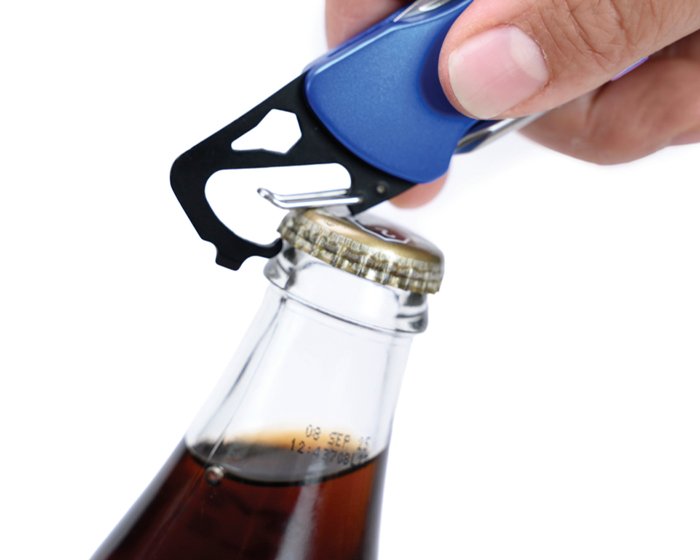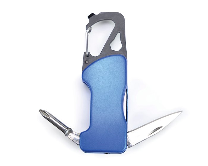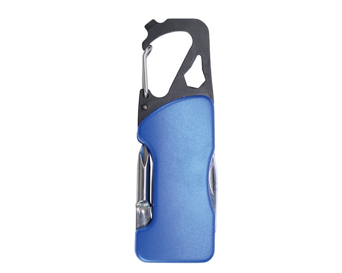 Gancho con clip multifunción que incluye: Luz LED con botón de encendido/apagado, navaja, destapador, llave allen, mini desarmador plano y desarmador de cruz.