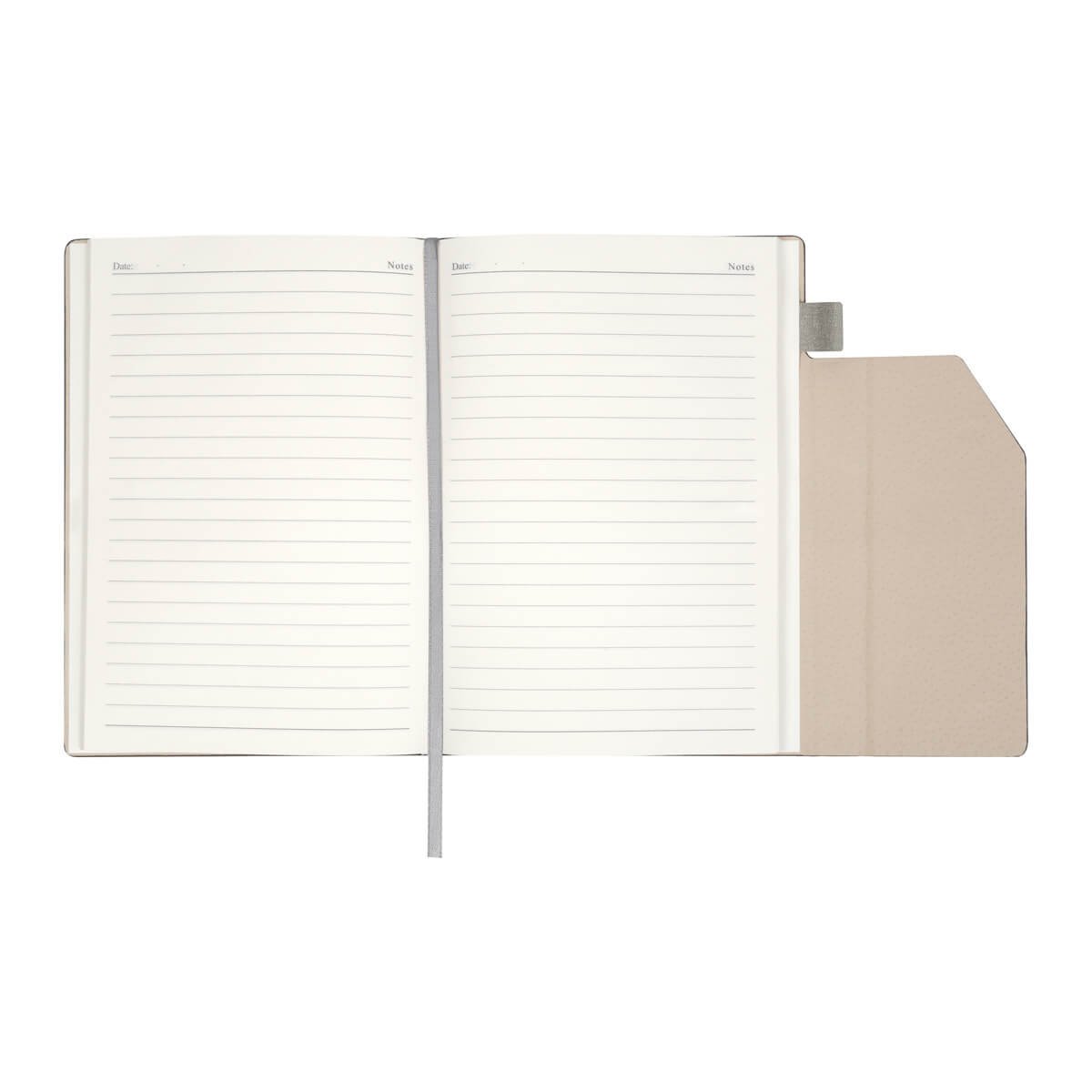 Libreta con 80 hojas a rayas. Cubierta rígida de curpiel y pestaña imantada plegable que ayuda a mantenerla cerrada. Incluye una banda especial para bolígrafo y listón separador de hojas.