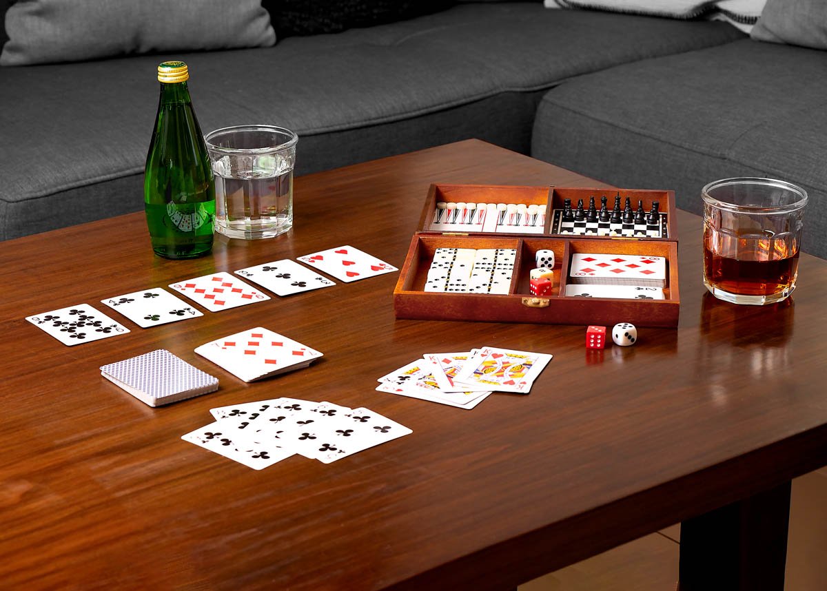 Incluye estuche de madera con juego de ajedrez, backgammon, 2 barajas plastificadas y dominó de 28 piezas