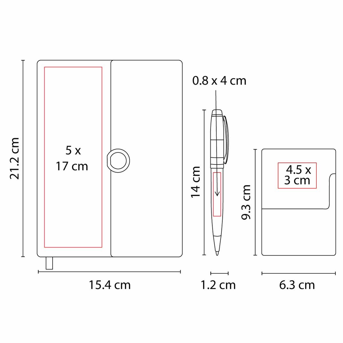 Incluye libreta con 80 hojas de raya, broche magnético y separador de hojas, bolígrafo tinta negra, tarjetero (posición vertical) y caja de regalo