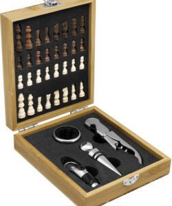 Incluye sacacorchos con navaja y destapador, stopper, arillo, termómetro, cortador y caja de madera con cerrojo tipo hebilla.