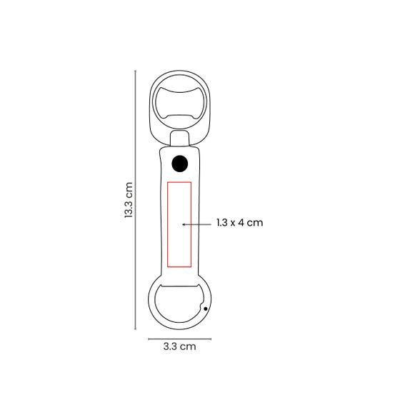 Llavero metálico con destapador, tira de curpiel y aro metálico tipo gancho.