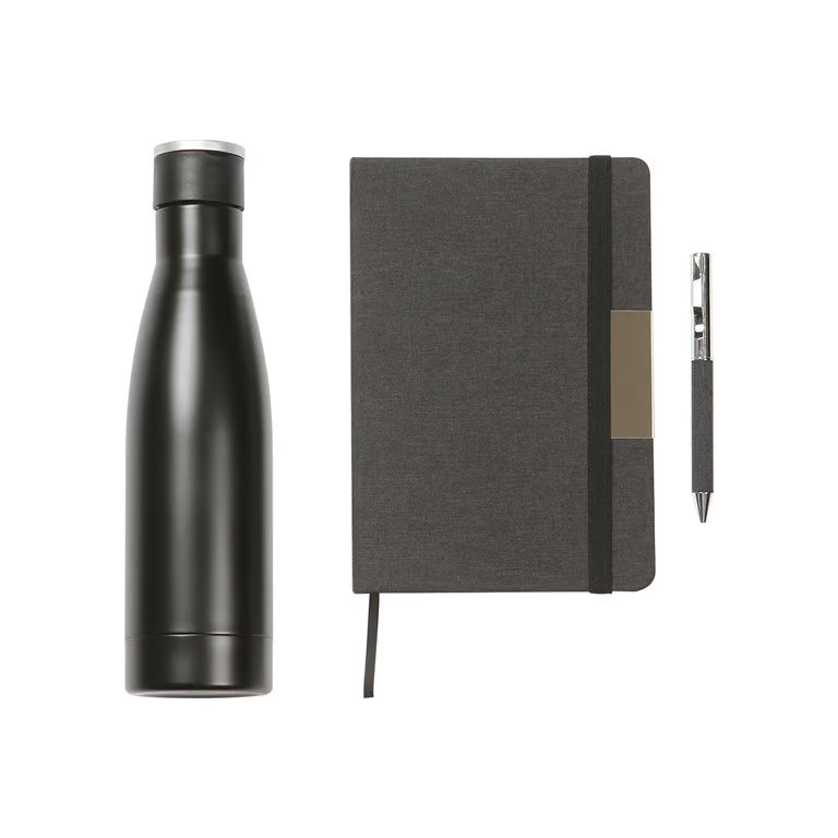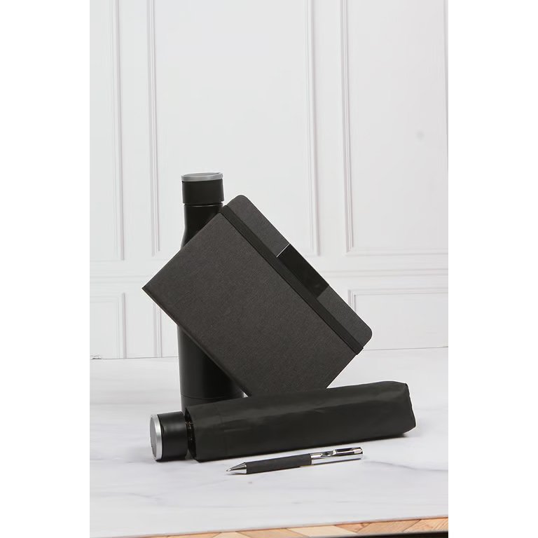 Set ejecutivo, incluye paraguas, termo de doble pared fabricado en acero inoxidable con capacidad de 500 ml. Bolígrafo con barril fabricado en latón y acero inoxidable con detalles en tela de PET reciclado, tinta de escritura azul. Libreta tamaño A5 con cubierta fabricada en PET reciclado con 80 hojas de 70g.