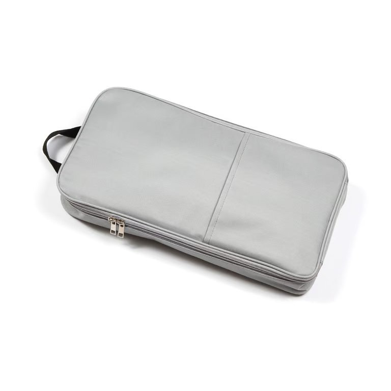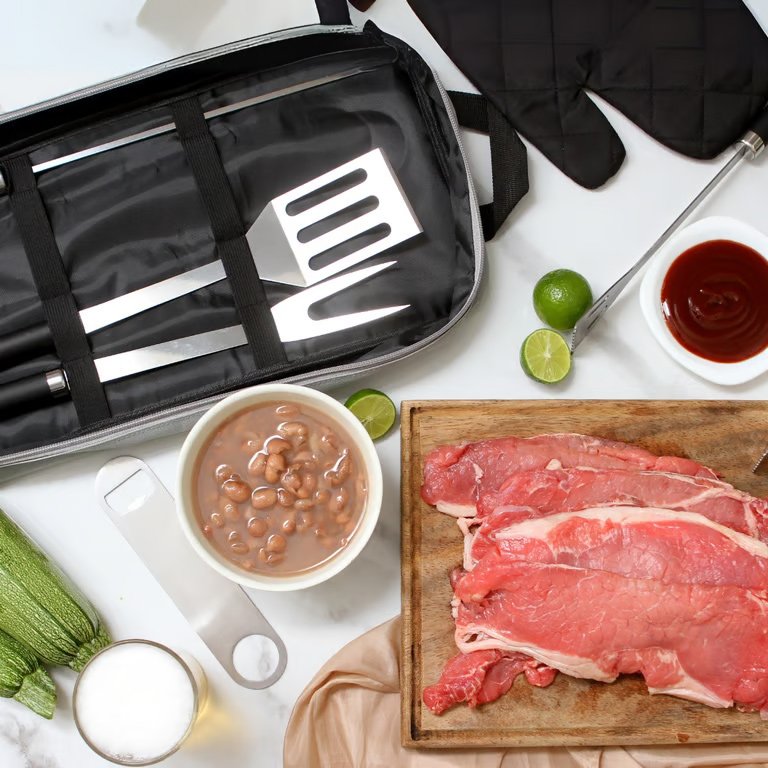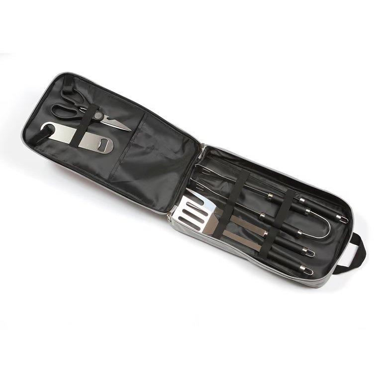 Set de BBQ con estuche fabricado en tela oxford (600D poliéster). Incluye juego de utensilios en acero inoxidable para asador: espátulas, tenedor, pinzas, tijeras, y destapador.