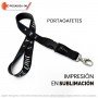 Portagafete fabricado en cinta satinada de 19 mm x 98 cm con impresión en sublimación a 1 cara. Terminado con broche desmontable, bandola perico y costura