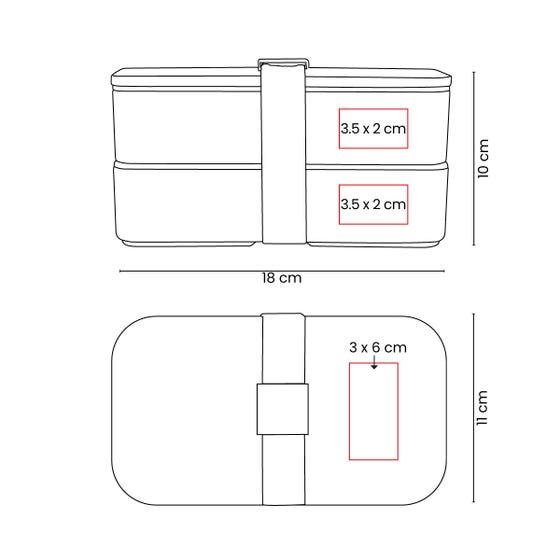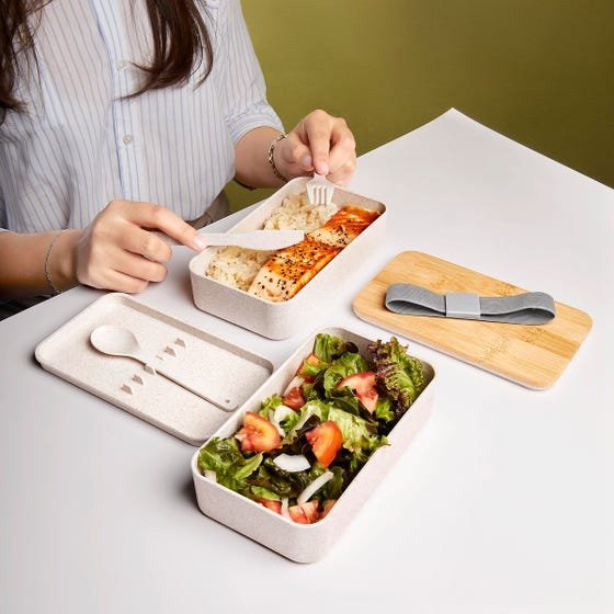 Contenedor de alimentos con doble compartimento. Capacidad total de 1 litro. Incluye tenedor, cuchillo y cuchara.